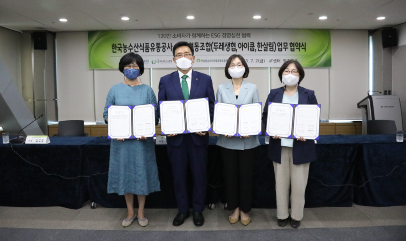 지난 7월 2일, 두레생협을 비롯한 3개 생협(두레생협, 아이쿱, 한살림)이 농수산식품유통공사와 ESG 경양실천을 위한 업무협약을 체결했습니다.