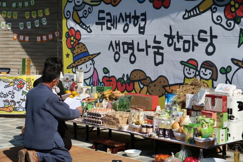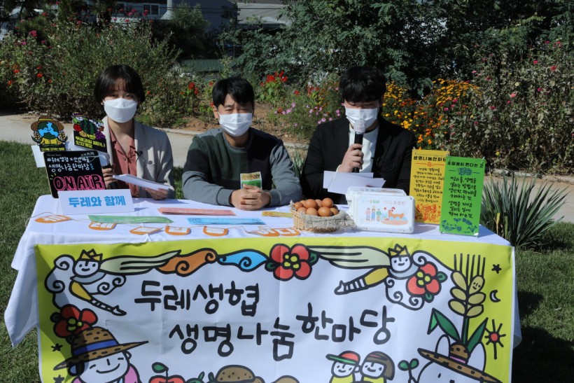 이번 생명나눔한마당은 두레생협 1호 생활재인 유정란을 공급하는 산안마을에서 열렀습니다. 산안마을은 지난 해 인근 농장에서 발생한 조류독감으로 예방적 살처분 명령을 받아 약 4만 여 마리의 닭을 살처분 해야 했습니다. 그 과정에서 조합원과 힘을 모아 일방적 살처분의 부당함에 대해 호소했고, 무조건적으로 살처분할 수 없도록 제도를 변경하는 소기의 성과를 거두기도 했습니다. 약 9개월 동안 유정란 생산이 중지되어 어려움을 겪은 산안마을을 응원하고자 2021 생명나눔한마당을 개최하게 되었습니다.