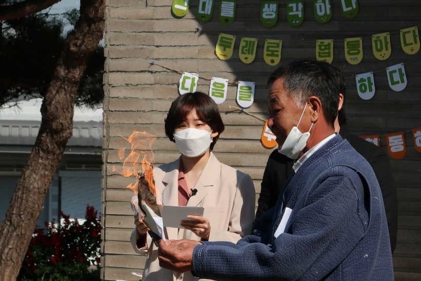 풍년을 기원하고 악귀를 쫓는 제문을 읽어주신 이진선 회장님께서 코로나19, 기후위기. 일회용품 등 우리를 힘들게 하는 일들이 내년에는 모두 물러가길 기원해주셨습니다.