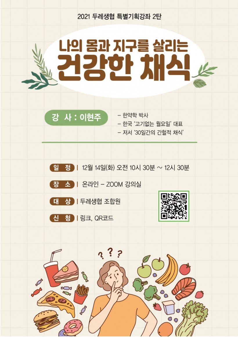 [공지] 2021 두레생협 특별기획강좌 2탄 <나의 몸과 지구를 살리는 건강한 채식> 페이지 정보 작성자 두레지기 작성일21-12-08 17:59 조회14,259회 댓글0건 목록 본문 강좌 신청하기 >> 목록
