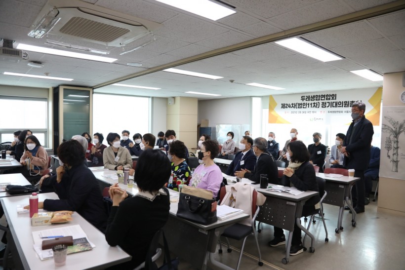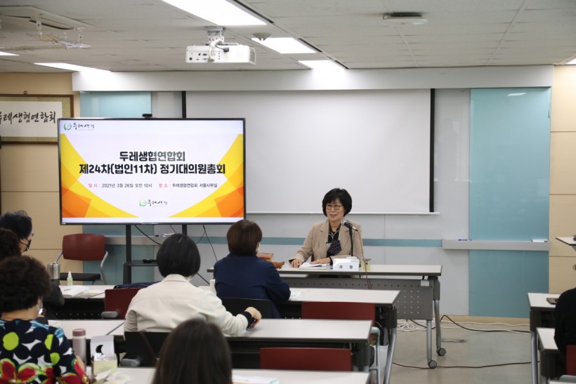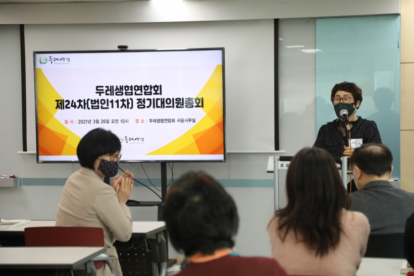 지난 3월 26일, 두레생협연합회 5층 회의실에서 제 24차(법인 11차) 정기대의원총회가 진행되었습니다. 코로나19로 인해 비대면 서면결의와 대면결의를 병행하여 진행되었습니다.각 회원생협 이사장을 중심으로 최소한의 인원이 참석한 가운데, 지난 한 해를 되돌아보는 영상과 구로시민두레생협 이정은 이사장의 사회로 1부 기념식의 문을 열었습니다.