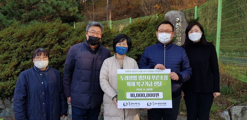 지난 추석 갑작스러운 화재로 공장이 전소되는 피해가 발생한 거제 푸른초장을 방문하여, 조합원 여러분과 생산자가 함께 모은 화재 복구기금 10,000,000원을 전달하고 왔습니다. 완전히 전소되었던 공장은 12월 중 복구를 목표로 마무리 작업에 박차를 가하고 있다고 합니다. 현재 남아 있는 1,3 공장에서 일부 대체 불가 품목을 제외한 나머지 생활재를 나눠서 생산하고 있는데, 앞으로 45일 후에는 새로운 공장에서 생활재를 생산할 수 있을 것이라고 합니다.