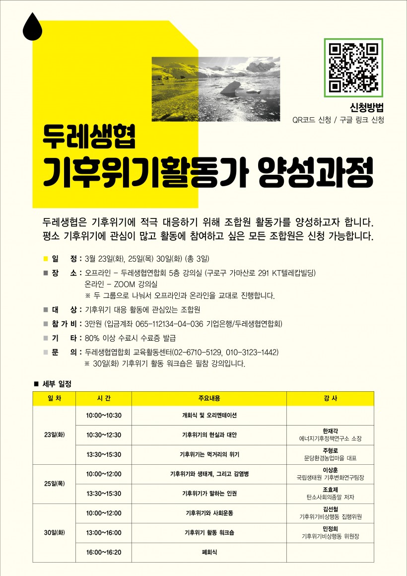 [안내] 두레생협 기후위기활동가 양성과정 참가자 모집 페이지 정보 작성자 두레지기 작성일21-02-16 12:30 조회20,595회 댓글0건 목록 본문 참가 신청하기>> 참가 신청하기>> 목록