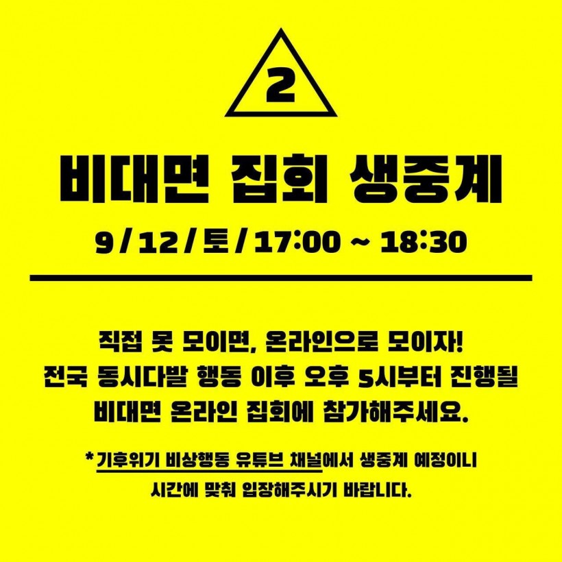 직접 못 모이면, 온라인으로 모여요! 전국 동시다발 행동 이후 오후 5시부터 진행될 비대면 온라인 집회에 참가해주세요(기후위기 비상행동 유튜브 채널 생중계 예정).