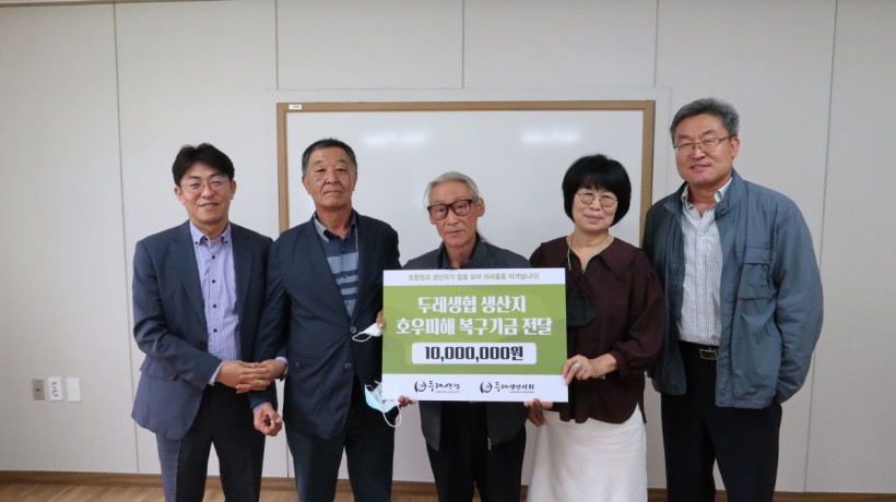 김영향 회장은 “어렵고 힘든 농업환경에 코로나가 겹치고 기상이변으로 이런 폭우가 발생하는 등 심려가 클 것 이라 생각합니다. 그럼에도 불구하고 두레생협 조합원에게 좋은 생활재를 공급하기 위해 노력하시는 생산자분들의 노고에 감사드리고, 생산자분들의 피해를 걱정하는 조합원들의 마음을 모은 1004기금이 호우피해 복구에 조금이나마 도움이 되었으면 좋겠습니다.”라고 말씀하셨습니다.