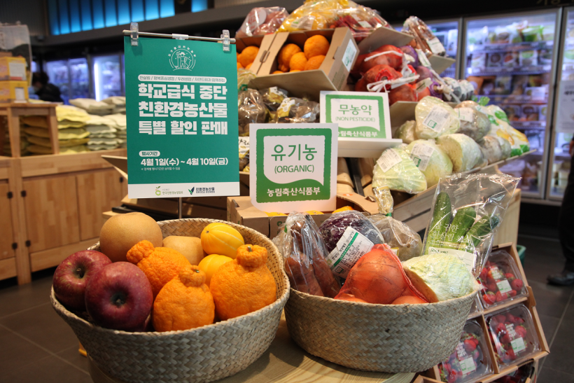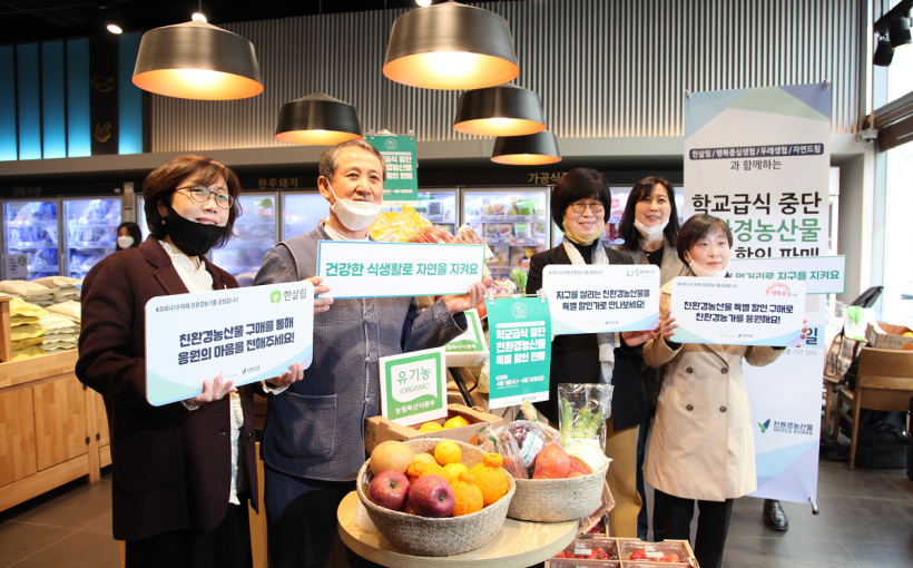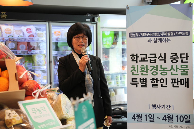 지난 4월 2일, 학교급식 중단으로 어려움을 겪고 있는 친환경 농가를 돕기 위한 <학교급식 중단 친환경농산물 특별 판매 캠페인> 홍보를 위한 기념식이 열렸습니다.