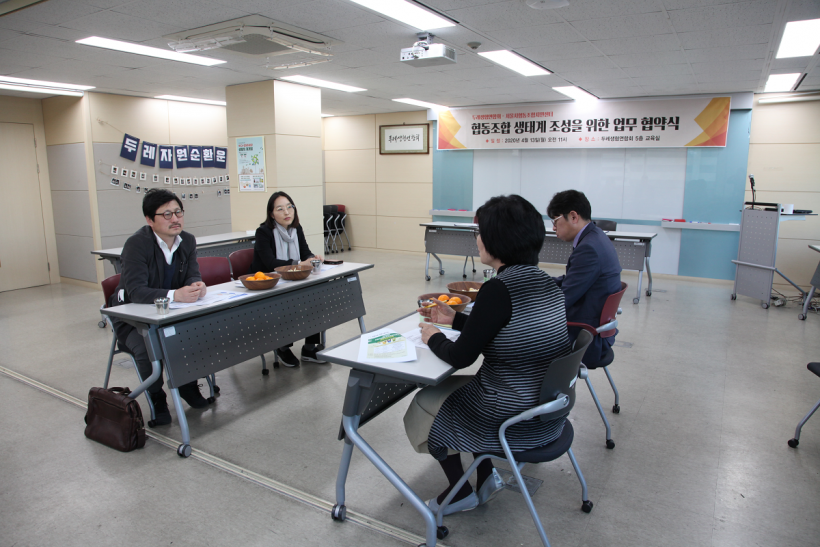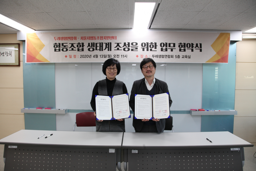 지난 4월 13일 두레생협연합회 5층에서 두레생협연합회-서울시협동조합지원센터 간 협동조합 생태계 조성을 위한 업무 협약식이 열렸습니다.