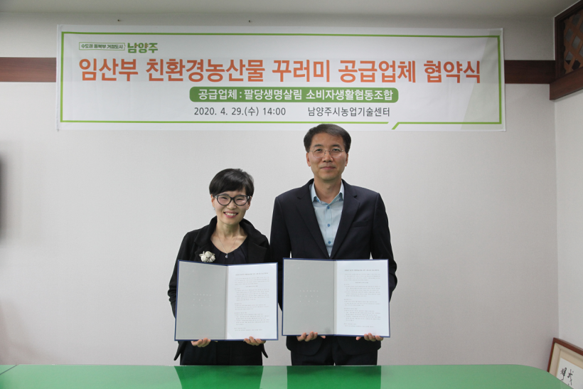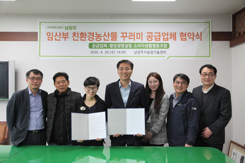 지난 29일, 두레생협의 회원생협인 팔당생명살림생협(이사장 장현례, 이하 팔당생협)과 남양주시농업기술센터(소장 구형서)간 남양주시 임산부 친환경농산물 꾸러미 공급업체 협약식이 열렸습니다.