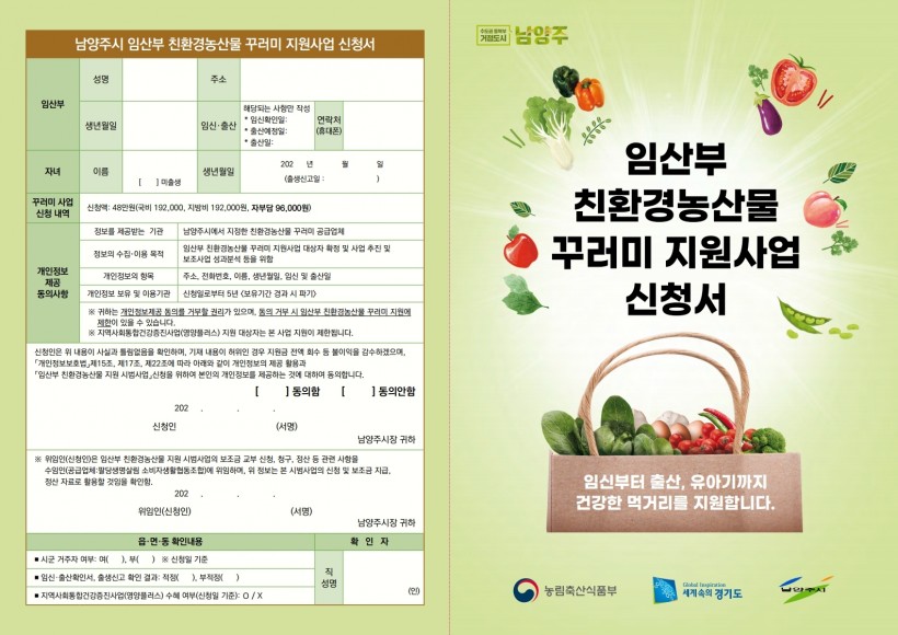앞으로, 남양주시 내 거주하는 지원 대상 임산부는 주소지 읍면동사무소에서 신청서를 접수한 뒤, 두레생협 친환경꾸러미 전용온라인몰에서 자부담 20%를 지불하면 매달 4만원 상당의 친환경농산물꾸러미를 팔당생명살림생협을 통해 받아 볼 수 있습니다. 첫 주문은 5월 14일(목) 오전 11시 30분이후부터 가능하며, 5월 18일(월)에 첫 공급될 예정입니다.