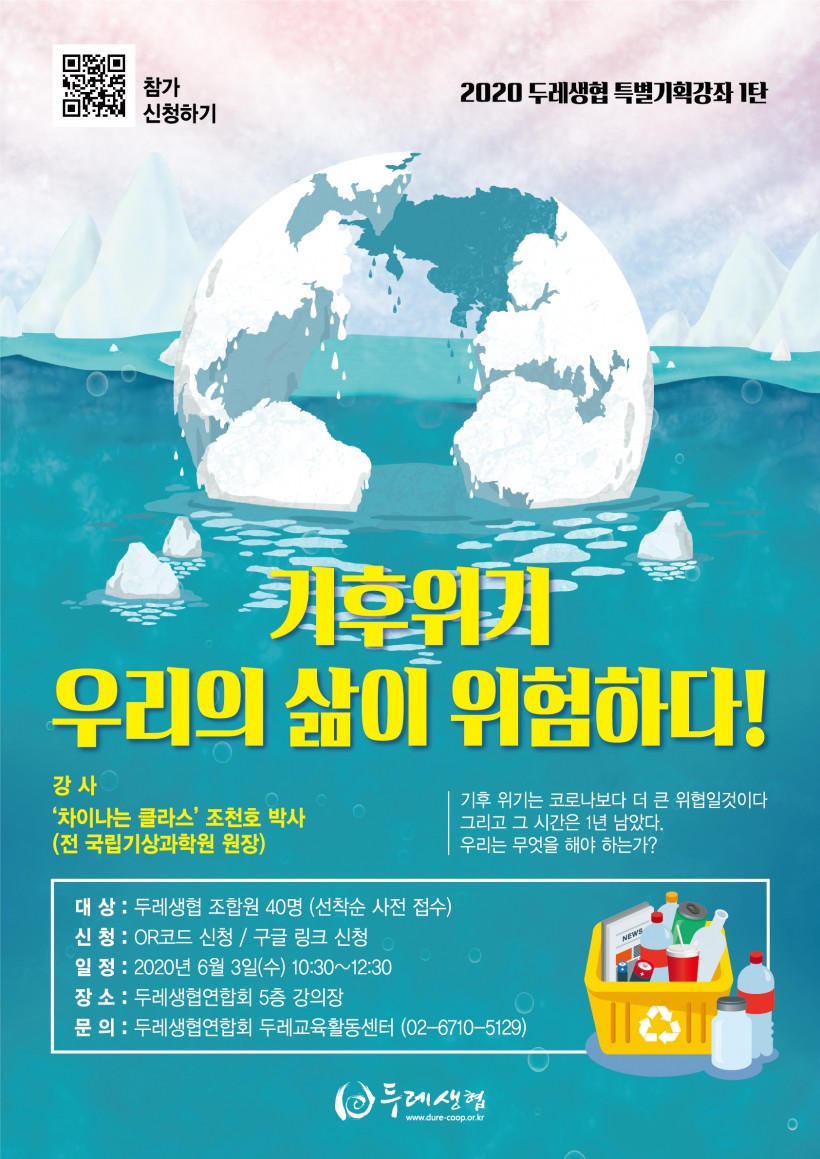 [공지] 2020 두레생협 특별기획강좌 1탄 <기후위기, 우리의 삶이 위험하다> 페이지 정보 작성자 두레지기 작성일20-05-13 11:05 조회22,211회 댓글0건 목록 본문 2020년 첫 기획 특강 '기후위기, 우리의 삶이 위험하다!' 기후위기는 코로나19보다 더 큰 위협일 것입니다. 그리고 그 시간은 얼마 남지 않았습니다. '차이나는 클라스' 조천호 박사(전 국립기상과학원 원장)님을 모시고 코앞까지 다가온 기후위기의 현실을 들어보려 합니다. 많은 신청 부탁드립니다. <<강의 신청이 마감되었습니다>> 목록