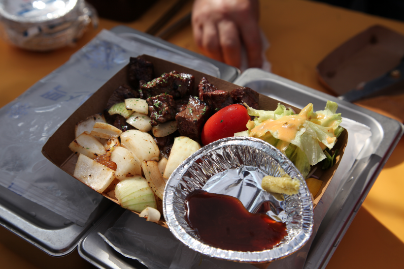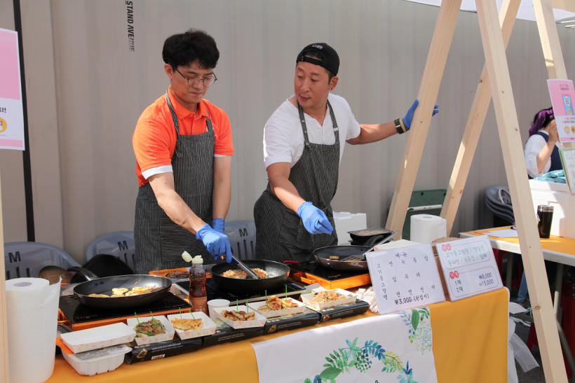 오전부터 시민들로 북적거린 곳은 바로 두레 생산자들이 운영하는 시식부스! 두레축산의 한우스테이크, 씨알축산의 깐풍기, 자연에찬의 전, 선농생활의 소시지 등 맛있게 굽는 냄새가 지나가던 사람들의 발길을 붙잡았습니다.