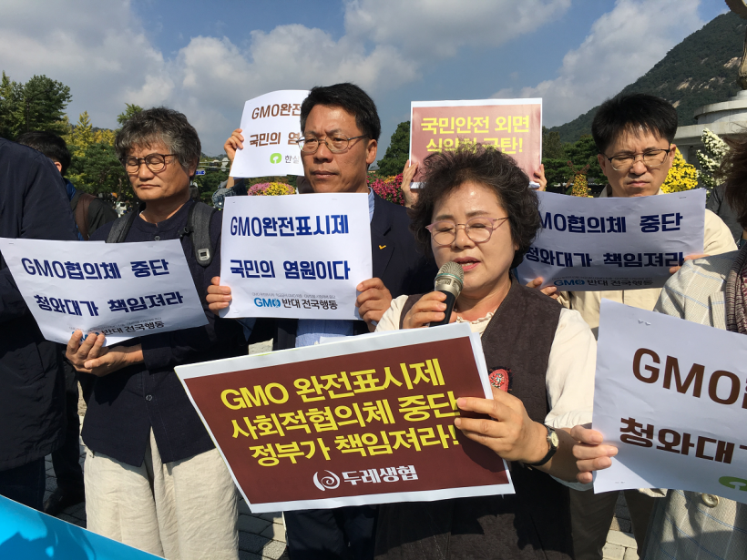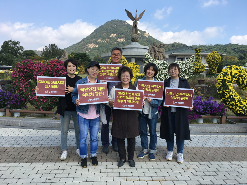 지난 10월 8일, 두레생협을 포함한 46개 소비자, 농민, 환경단체로 구성된 「GMO반대전국행동」은 청와대 사랑채 앞에서 GMO 협의체 중단에 대한 청와대의 책임을 묻는 기자회견을 열었습니다.