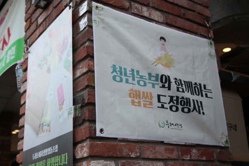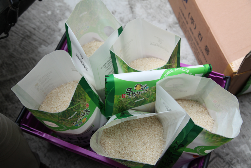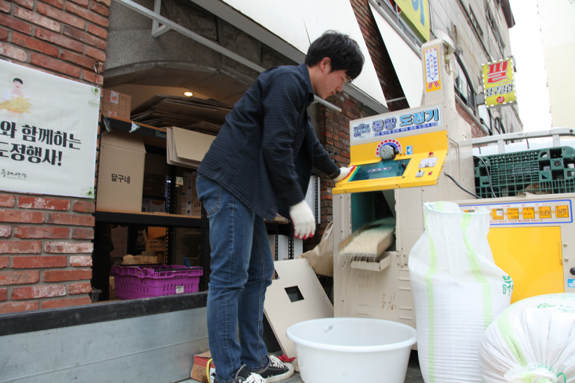 첫 날 방문했던 경기남부두레생협 본오점에서는 리뉴얼 개장행사가 한창이었는데요, 전력을 많이 소비하는 도정기가 속을 썩였지만, 갈색 현미가 뽀얀 백미로 변하는 모습은 다시 봐도 신기했답니다.
