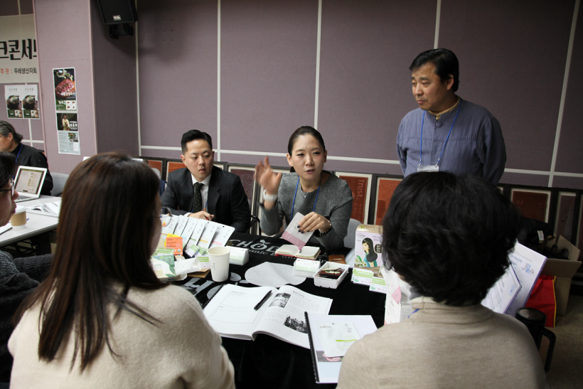 두레생산자회 교육위원회 위원장이신 최성철 씨에이치하모니 대표의 인사말과 함께, 본격적으로 이 날 행사를 시작했습니다. 총 20개 생산지를 다 돌아볼 수 있도록, 각 생산지 별로 8분이라는 시간 제약을 두었습니다. 제한 시간이 지나도 계속 이야기를 나누는 바람에 다음 순서를 기다리는 등 시작부터 뜨거운 열기를 보였습니다. 중간에 쉬는 시간에도 끊임없이 생활재에 대한 이야기를 나누고 이야기꽃을 피워냈습니다^^