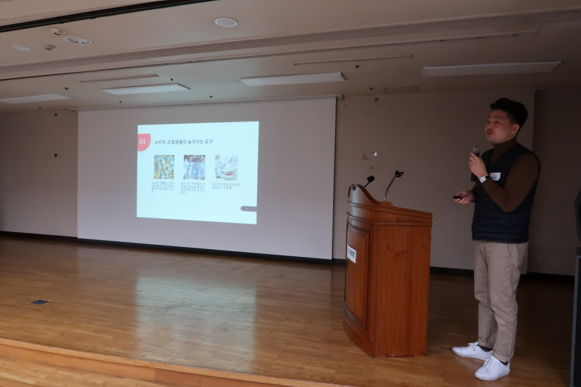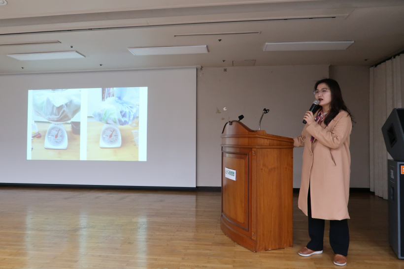 첫 번째 발제를 맡은 푸든두레생협 이정민 환경위원회 위원장은 조합원을 대표하여 <자원순환을 위한 두레생협의 포장재 정책과 방향에 대한 제안>에 대해 발표하였습니다. 두레생협 생활재로 어묵탕 하나만 끓여도 비닐 포장재가 최대 9개까지 나온다는 점을 지적하면서, 비닐류도 대부분 OTHER류라서, 재활용이 잘 안 된다는 점도 지적하였습니다. 앞으로 비닐 포장의 간소화를 요청하면서, 이번 김장에 쪽파를 종이에 싸서 보내준 생산자와 부직포 재질을 광목천으로 바꾼 생산자에게 감사하다는 메시지까지 전해주었습니다.