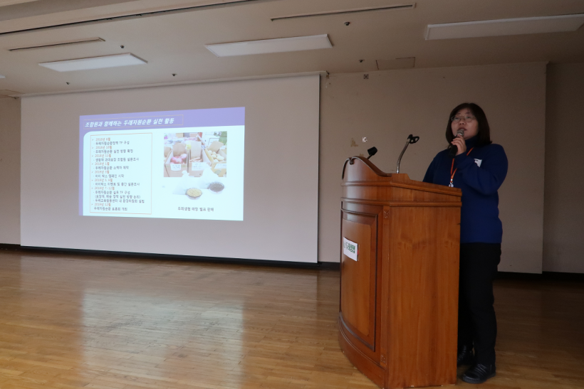 네 번째 발제는 <조합원과 함께 하는 두레생협의 자원순환 실천 활동>이라는 주제로 두레생협연합회 두레교육활동센터 유경순 국장이 발표했습니다. 2019년 한 해 동안 두레생협이 자원순환을 위한 추진한 다양한 활동을 소개했습니다. 특히 3월부터 시작한 스티로폼박스 대신 조합원의 아이스박스에 생활재를 공급받는 마이박스 캠페인에는 1,732명의 조합원이 참여하고 있는데, 조합원 여러분의 도움으로 스티로폼 박스 구입비용 2,000만원을 절약했고, 버려지는 스티로폼 박스도 그만큼 줄일 수 있었다고 강조하였습니다, 내년에는 아이스팩이나 장바구니를 재사용할 수 있는 방안을 마련할 계획이라고 밝혔습니다.