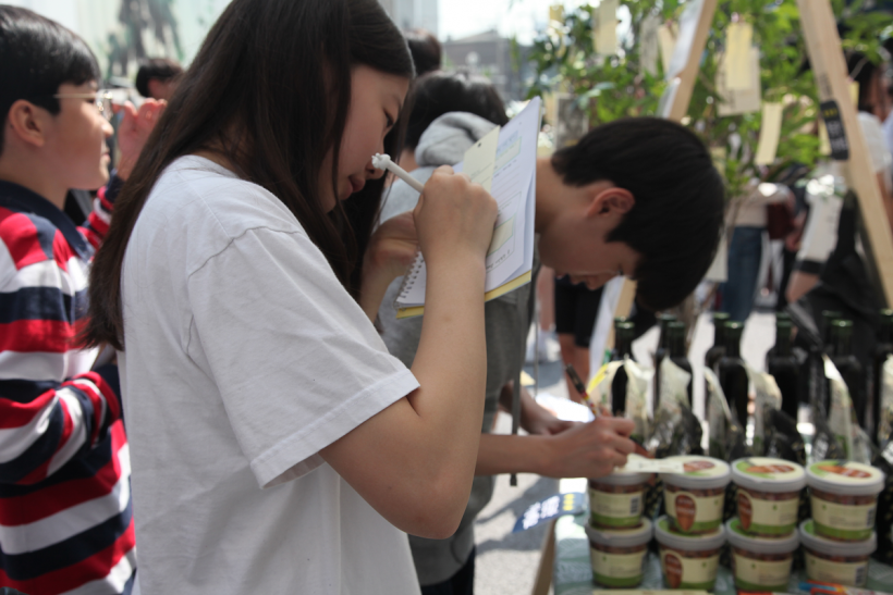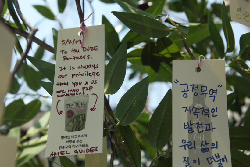 공정무역과 민중교역을 잘 몰랐던 시민들도 설명을 들으면서 공감해주셨고, 무엇보다 학생들의 참여가 뜨거웠습니다. 얼마 지나지 않아 올리브 나무에는 시민들이 남겨주신 메시지가 빼곡하게 달렸습니다. 히드미 대표님과 노르마 의장님, 아리엘 대표도 공정무역과 민중교역에 대한 뜨거운 시민들의 관심에 감사의 표현을 담은 메시지를 남겨주셨습니다.