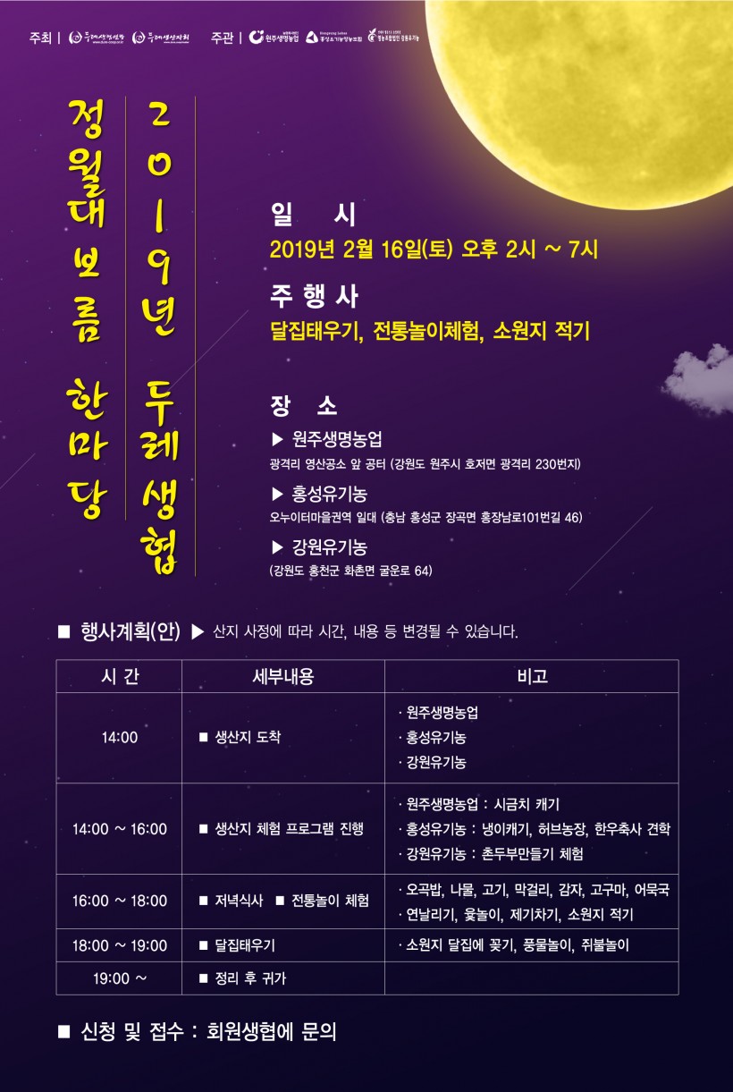 2019년 두레생협 정월대보름 한마당 페이지 정보 작성자 두레지기 작성일19-01-22 14:46 조회28,889회 댓글0건 목록 본문 2019년 두레생협 정월대보름 한마당 행사에 조합원 여러분을 초대합니다. 참여하고 싶으신 조합원께서는 생산지 별 회원생협 리스트를 참고하시어, 소속 회원생협으로 참가 신청하시기 바랍니다. ◆원주생명농업 : 주민두레생협, 원주생협, 울림두레생협, 참좋은두레생협, 푸른두레생협, 에코생협◆강원유기농 : 경기두레생협, 서울남부두레생협 * 구제역으로 인해, 홍성유기농 행사는 취소되었음을 알려드립니다. 목록