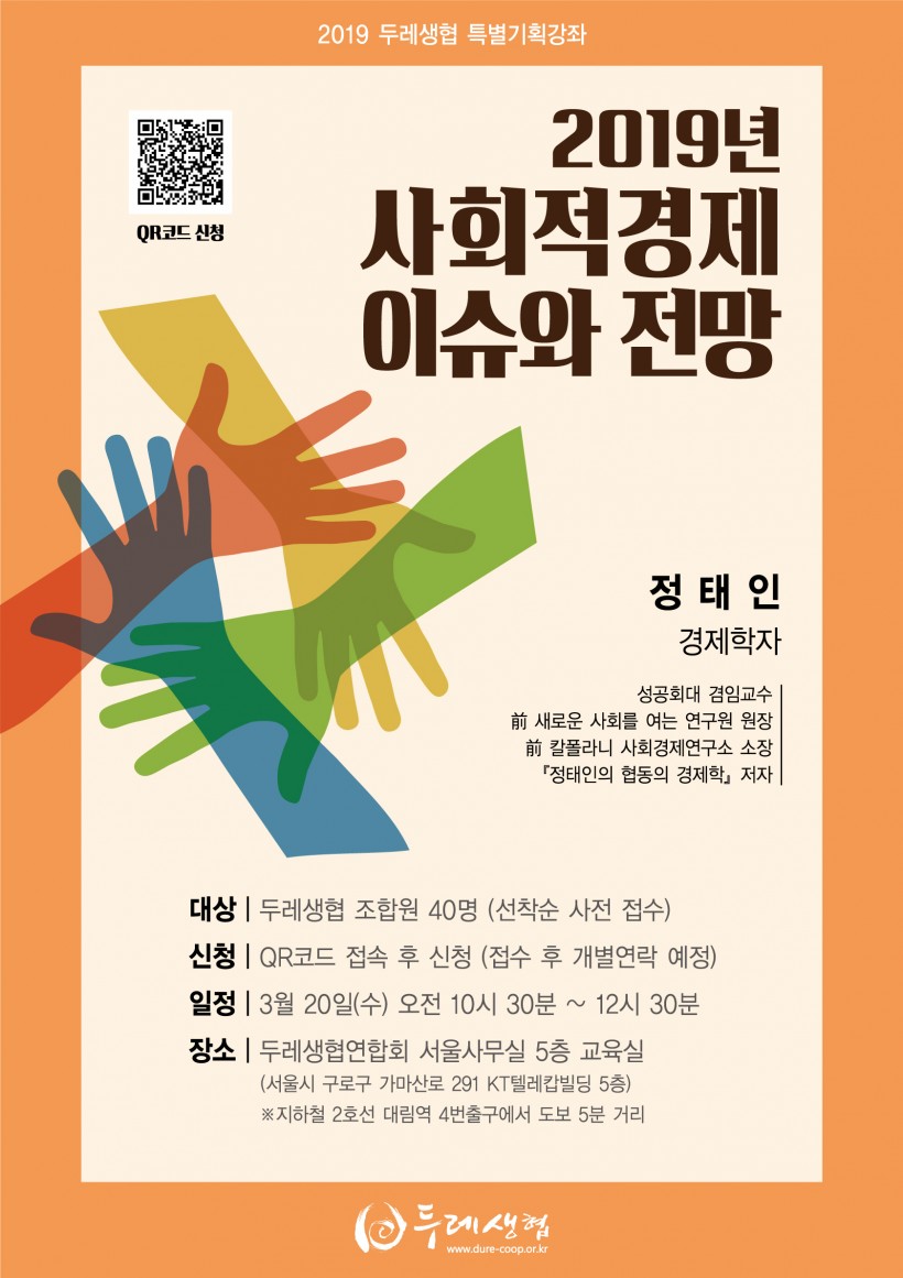 [알림] 2019년 사회적경제 이슈와 전망 강의 신청하세요 페이지 정보 작성자 두레지기 작성일19-02-22 09:49 조회24,641회 댓글0건 목록 본문 ※ 강의 신청하기 ※ ※ 강의 신청하기 ※ 목록