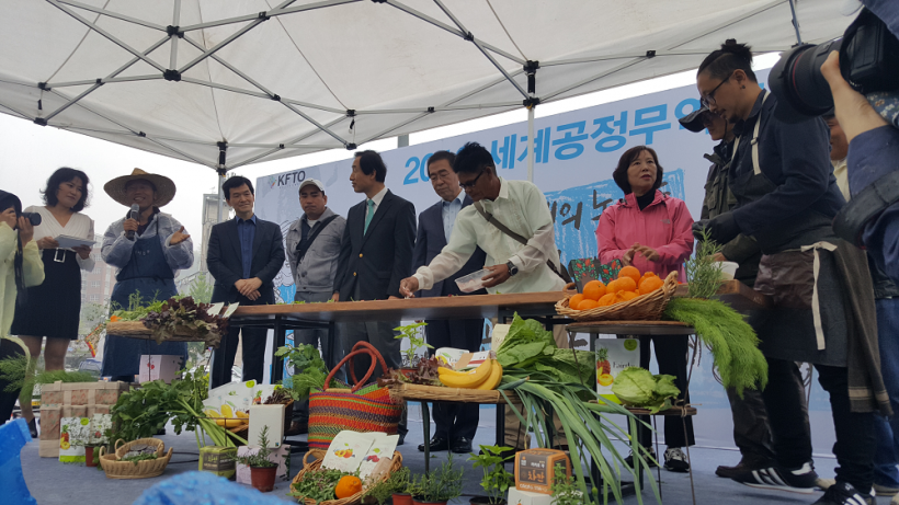 박원순 서울시장과 공정무역 관계자 및 두레생협 마스코바도 생산자가 함께 모여 공졍무역 식재료로 음식을 플레이팅하는 퍼포먼스로 올해 행사의 시작을 알렸습니다. 두레생협-피티쿱 부스에서는 두레생협의 대표적인 민중교역 생활재로 새롭게 떠오른 발랑곤 바나나 홍보에 나섰습니다. 두레생협 발랑곤바나나 서포터스들은 비가 오는 가운데서도 시민들에게 발랑곤바나나를 나눠주고 발랑곤바나나의 의의를 전달하고자 빗속을 분주하게 오갔습니다.