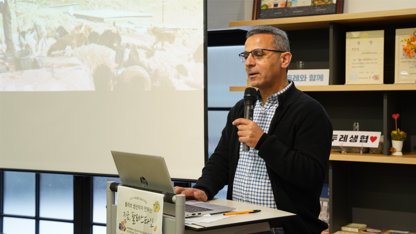 올해는 5월 12일부터 24일까지를 민중교역주간으로 정하고 지난 5월 14일부터 16일까지, 두레생협은 팔레스타인 생산자들을 초청해 뜻깊은 연대의 시간을 가졌습니다. 이번에 한국을 찾아와 준 분들은 팔레스타인 농업 NGO인 UAWC의 대표 푸아드 아부 사이프(Fuad Abu Saif) 와 국제협력담당자 사나(Sana’) 입니다. 팔레스타인 농민들과 여성, 청년들이 처한 현실과 그 안에서 피어나는 삶의 이야기, 그리고 국제 연대의 중요성에 대해 진심을 담아 들려주었습니다.