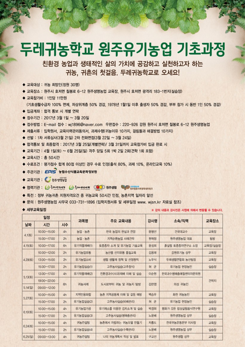 두레귀농학교 원주유기농업 기초과정 신청 안내