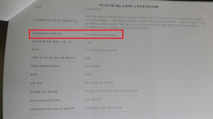 <이마트 온라인몰에 올라온 인도산 GMO찐쌀의 상세정보 화면>