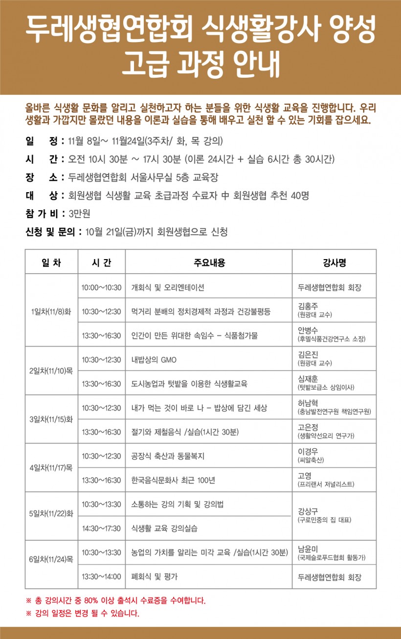 두레생협 식생활강사 양성 고급과정 안내