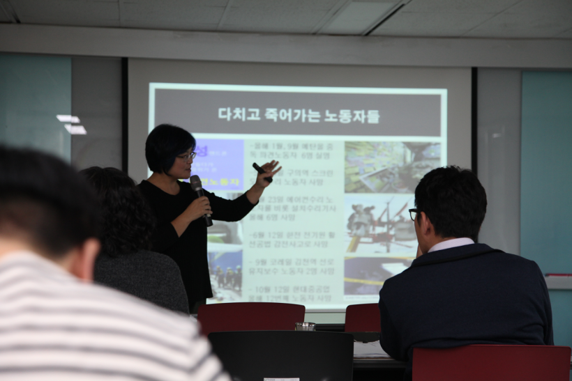 우리나라에서 산업재해를 당하는 노동자가 1년에 평균 2,400명이 넘는다고 합니다. 올 한 해, 언론에 크게 보도된 구의역 스크린도어 참사 외에도 휴대폰 제작 하청업체에서 메탄올에 중독되어 6명이 실명했으며, 안전장치 없이 일하던 에어컨 수리기사의 추락사, 활선공법으로 인한 전기원의 감전사 등 산재로 인한 사망이 끊이지 않고 벌어지고 있다고 말씀했습니다.