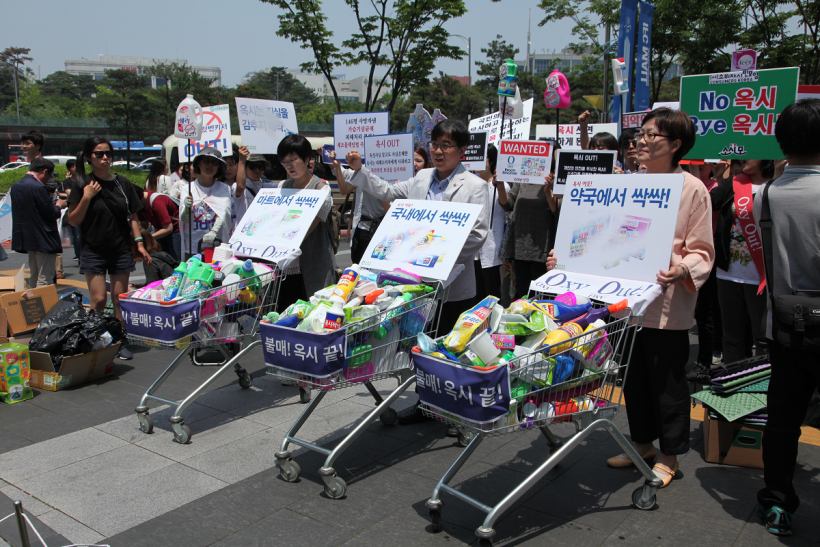 지난 5월 31일, 여의도 옥시 본사 앞에서 ‘옥시 불매’ 2차 집중행동 보고대회가 열렸습니다. 두레생협에서는 5월 18일부터 27일까지 옥시 제품을 가져오면 두레생협 대안생활재를 할인공급하는 옥시 불매운동을 펼쳐, 매장에서 모은 옥시 제품을 환경운동연합에 전달하였습니다. 이 날 보고대회가 열린 여의도 옥시 본사 앞에서는 두레생협을 비롯하여 전국에서 수거한 옥시 제품 2천 여 개를 이용하여, 옥시 불매라고 적인 과녁에 옥시 제품을 던지는 퍼포먼스 등을 펼치며 옥시 불매에 대한 강한 의지를 표명하였습니다.