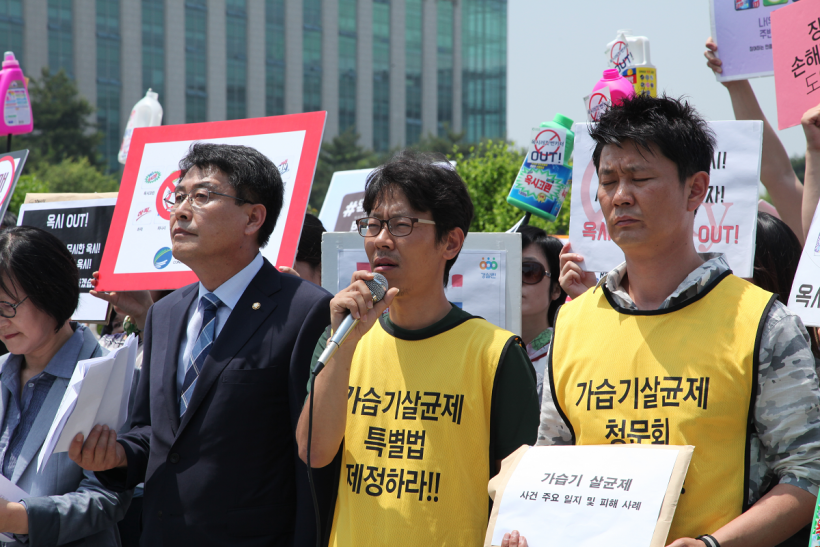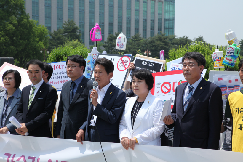 옥시 본사에서 국회까지 도보행진을 한 뒤에는 국회 앞에서 어제 개원한 20대 국회의원들과 함께 기자회견을 열었습니다. 더불어민주당 정춘숙 의원, 국민의당 송기섭 의원, 채이배 의원, 김광수 의원, 정의당 윤수화 의원 등이 참석하여 국회 차원에서도 법안 제정 및 개정에 힘을 보태겠다고 했습니다. 가습기 살균제 피해자와 가족모임(가피모) 안성우 운영위원과 강찬호 대표는 참석하여, 다시는 이러한 일이 재발되는 것을 막기 위해 포기하지 않고 끝까지 노력할 것이라고 말씀해주셨습니다.
