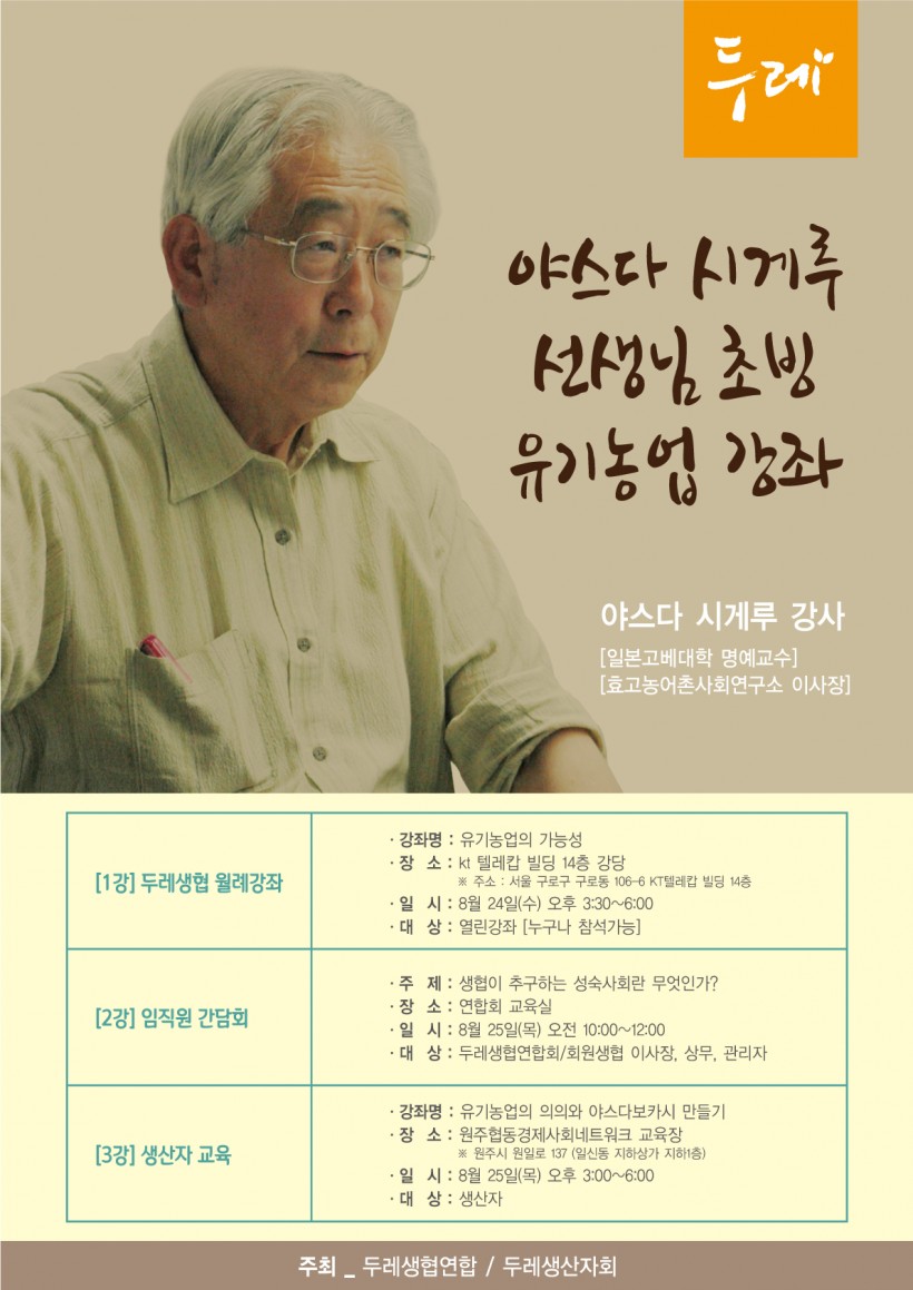 두레생협연합회에서 저 성장시대에 대응하는 생협운동의 역할과 과제를 재조명하기 위해 일본 유기농업의 아버지로 불리우는 야스다 시게루 선생님을 모시고 특별초청 강연회를 개최합니다.