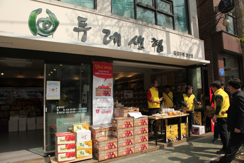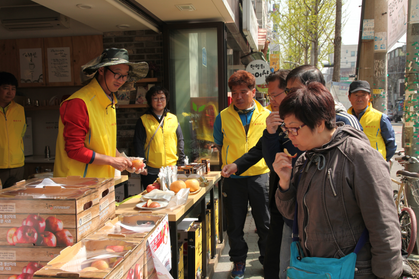 두레생협은 지난 4월 4일부터 일주일 동안, 생산자의 지속가능한 생산기반 마련을 위한 두레사과 5kg 기획판매를 진행하였습니다. 이번 사과 기획판매를 홍보하기 위해 주말을 앞둔 금요일, 울림두레생협 성산점에 두레생협의 오랜 동반자인 의성생산자회 생산자들이 먼길을 달려 방문해주셨습니다. 소비자 조합원을 직접 만나 두레사과를 소개하고자, 정성껏 기른 맛있는 사과를 조합원께 직접 깎아 제공하는 시식행사를 진행하였습니다. 조합원 여러분께서 많은 관심을 보이시고 구매로 응답해주신 덕분에, 생산자들도 힘이 나는 시간이었습니다.