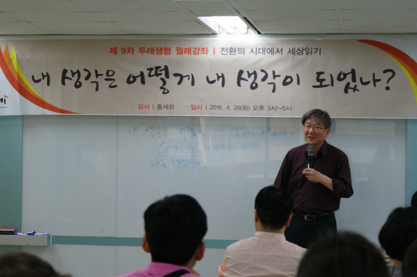지난 4월 26일, 2016년의 첫 월례강좌인 제9차 두레생협 월례강좌가 열렸습니다. 올해 첫 월례강좌의 시작은 ‘나는 빠리의 택시운전사’ 책을 쓰신 홍세화 선생님께서 열어주셨습니다. ‘내 생각은 어떻게 내 생각이 되었나?’라는 질문을 주제로 강의를 진행해주셨습니다.