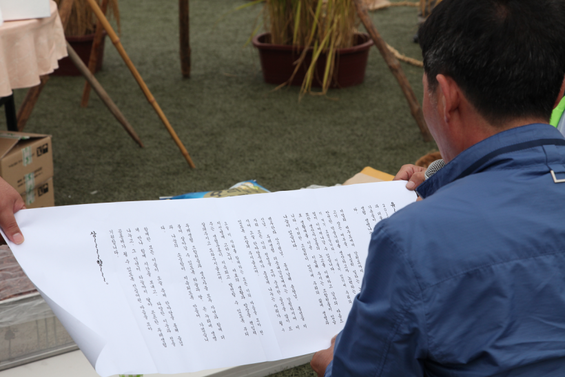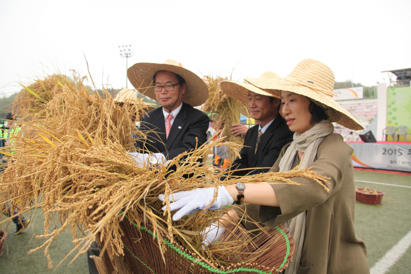 홍성유기농영농조합 정상진 대표의 환영사와 홍성군 류순구 부군수님, 홍성군의회 윤용관 의원님의 축사에 이어, 내빈들이 직접 벼를 베어 수확한 벼를 제단에 올리는 것으로 기념식이 마무리되었습니다.