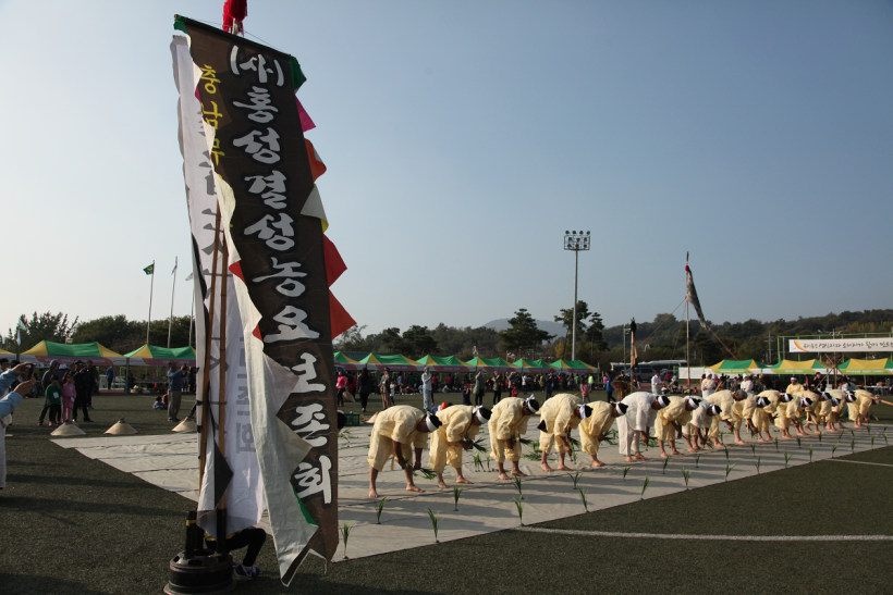 이번 생명나눔한마당의 마지막은 충청남도 무형문화재 20호로 지정된 결성농요가 장식했습니다. 결성농요는 홍성군 결성면에서 이어져 내려오는 농요와 두레를 옛 모습대로 재현한 것으로, 마을 주민들이 힘을 모아 함께 모내기를 하면서 농요를 부르던 풍경을 엿볼 수 있었습니다. 모내기와 논물대기의 어려움을 이겨내는 퍼포먼스에 공연자, 조합원 및 생산자 여러분이 함께 참여하여 흥을 돋웠습니다.