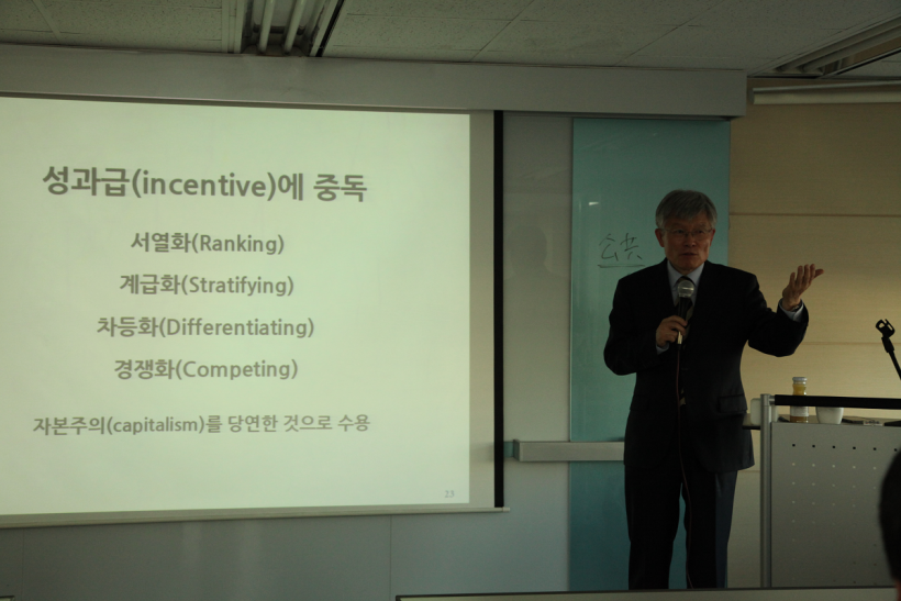 조직 운영의 중요한 부분인 인사(人事)에 대해서는 돈이나 설비와 같이 사람을 하나의 자원으로 여기는 미국식 사고가 일하는 사람들로 하여금 오로지 보상에 의해서만 움직이도록 만들었다고 지적하였습니다. 사람들 간의 서열화, 계급화, 차등화, 경쟁화로 돈과 성과급에 중독되면 성취감과 자발성이 떨어지게 된다며, 일하는 사람의 생산성과 창의성을 높이려면 인간존중 사상에 기반한 시스템이 구축되어야 한다고 말해주셨습니다.