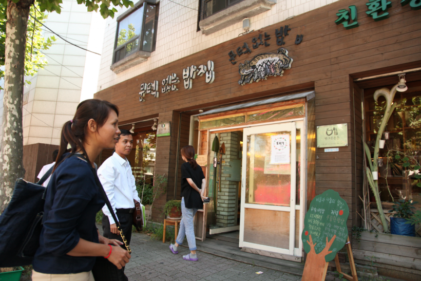 울림두레생협과 성미산마을에 대한 간단한 소개 뒤에, 사회적협동조합인 문턱 없는 밥집에 방문하여 점심식사를 같이 하며 이야기를 나누었습니다. 문턱 없는 밥집은 울림두레생협을 포함하여, 성미산마을 인근 단체와 주민이 함께 출자한 사회적협동조합으로서, 친환경 먹거리로 음식을 만들고, 자율적으로 밥값을 내도록 하여 누구나 식사를 할 수 있도록 했습니다. 지역복지와 친환경 먹거리 문제를 협동조합 방식으로 해결하는 음식점으로 Sowath과 Panha도 많은 관심을 보였습니다.