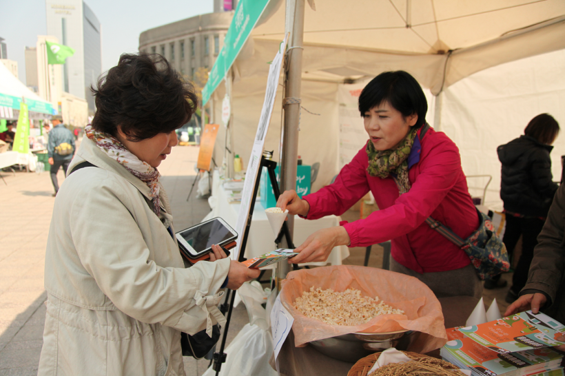 토종종자 소개와 함께, 아직 위험성이 널리 알려지지 않은 유전자 조작생물(GMO)에 대한 인식을 일깨우고, GMO 표기의 필요성을 알리기 위해 국산 무농약 옥수수로 만든 고소한 팝콘을 제공해, 많은 시민들의 호응을 받았습니다.