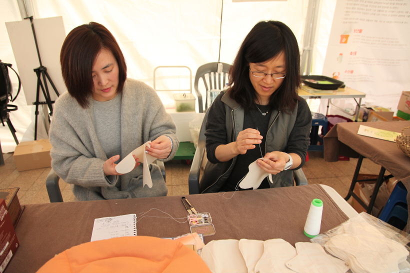 세 번째 부스에서는 마을 주민과 발달장애청년들의 일공동체인 성미산좋은날협동조합에서 공정무역 원두로 내린 더치커피와 조합원이 한 땀 한 땀 직접 만든 비누두레의 찜질팩과 눈지압베게를 선보였습니다. 친환경 면생리대를 만드는 시연과 함께 직접 체험도 할 수 있었습니다.