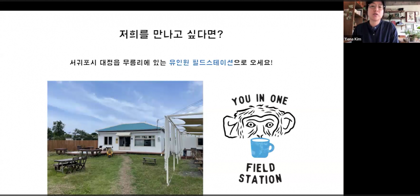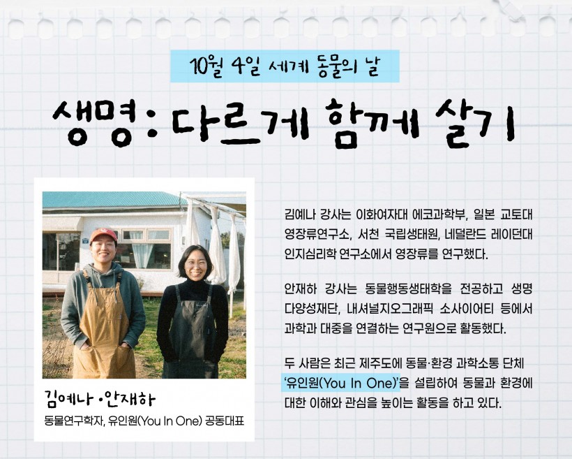 이번 강좌는 10월 4일 세계 동물의 날을 맞이하여, 동물의 마음을 이해하고 생물다양성에 대해 알아봄으로써 인간 중심에서 벗어나 연대하는 마음을 갖는 것을 목표로 하였습니다. 최근 제주도에 동물·환경과학소통단체 ‘유인원(You In One)’을 설립하여 동물과 환경에 대한 이해와 관심을 높이는 활동을 하고 있는 김예나•안재하(동물연구학자, 유인원(You In One) 공동대표) 강사 두 분이 강의를 진행하였습니다.