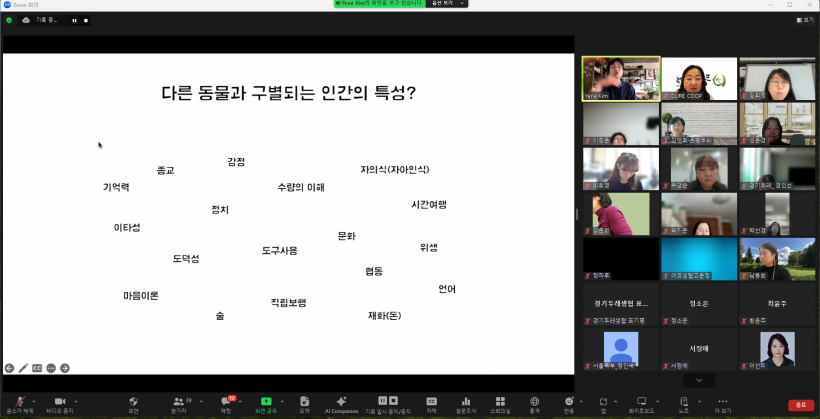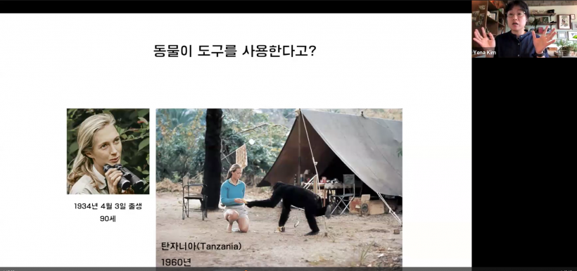 김예나 강사는, ‘동물의 마음 이해’ 부분에서 동물의 도구 사용, 기억력, 위생, 협동, 감정 등에 대한 연구자료와 영상 등을 보여주면서 인간을 포함한 모든 동물은 저마다의 방식으로 다 특별함을 갖고 있음을 설명하였습니다.