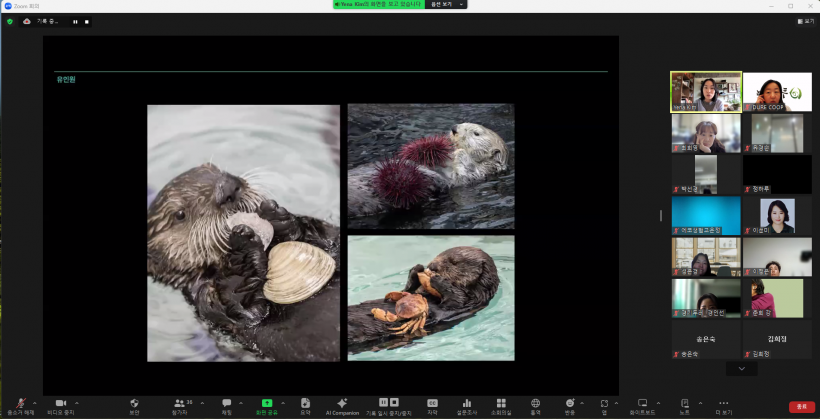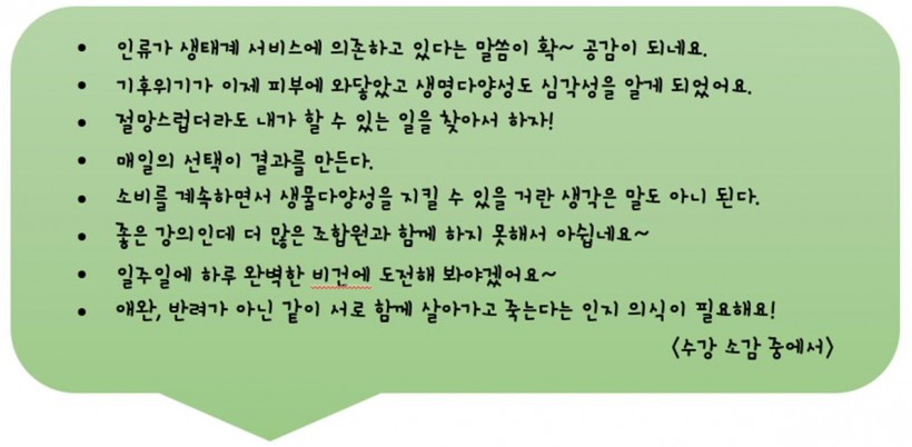 안재하 강사는, ‘생명다양성 알아보기’ 부분에서 해달, 파이카( Pika, '피카츄'의 실제 모델로 알려짐), 열대우림 소형 포유류 등의 멸종위기 연구 사례를 통해 생물다양성 위기의 심각성을 설명하였습니다. 한 연구기관의 발표 사례를 들면서 지구 생물다양성과 생태계 파괴 원인은 주로 인간의 활동인데, ‘사람들이 자연과 연결되지 않는 것, 자연의 중요성을 중요하게 생각하지 않는 것’이 문제라고 하였다라는 내용에서는 숙연해질 수 밖에 없었습니다.