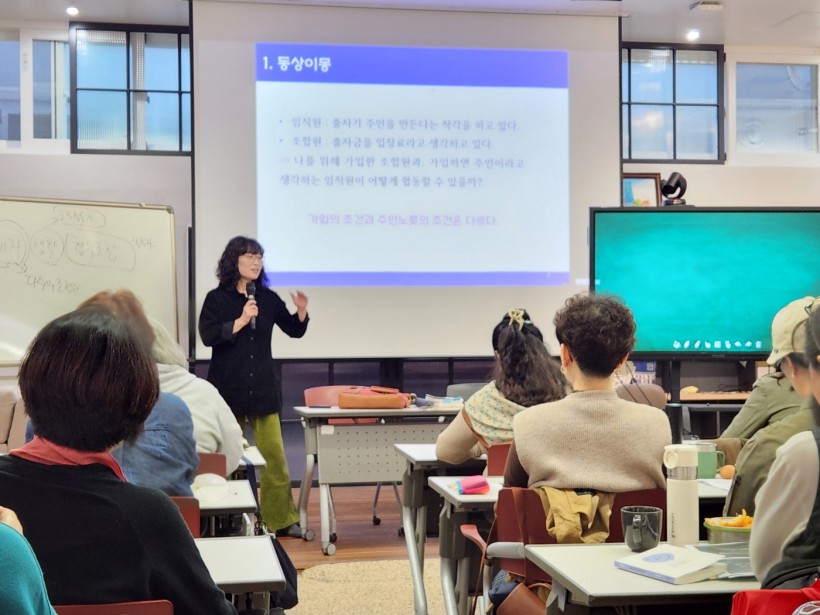 11월 4일 월요일, '협동조합의 돈과 민주주의'의 저자인 김신양 강사(한국사회적경제연구회장)와 함께한 강의는 질문과 답변 형식으로 진행하였습니다. 참가자들은 사전에 책을 읽은 후 질문을 제출하였고, 강사는 이를 바탕으로 협동조합의 정의, 원칙, 다양한 사례, 그리고 자본의 운용 등을 설명하였습니다. 협동조합의 원칙을 다시! 제대로! 짚어보면서 노동의 협동, 자본의 협동, 생각의 협동이 실제 현장에서 어떻게 실현할 수 있을지 고민하고 상상하는 시간이었습니다.
