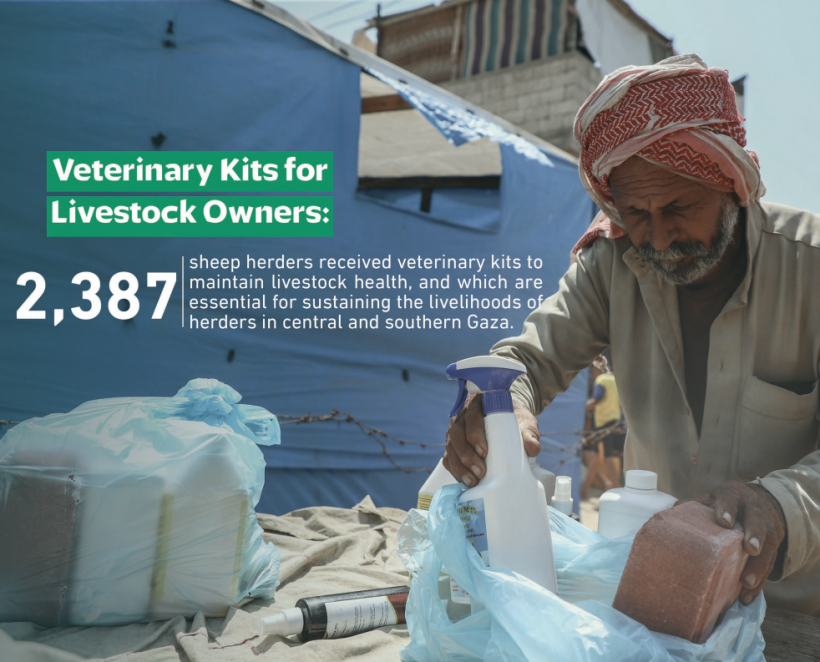 - 수의학 키트 배포: 가자 중부 및 남부 지역에서 양치기들이 가축 건강을 유지하기 위해 수의 키트를 받았으며, 이는 그들의 생계 유지를 위해 필수적입니다.