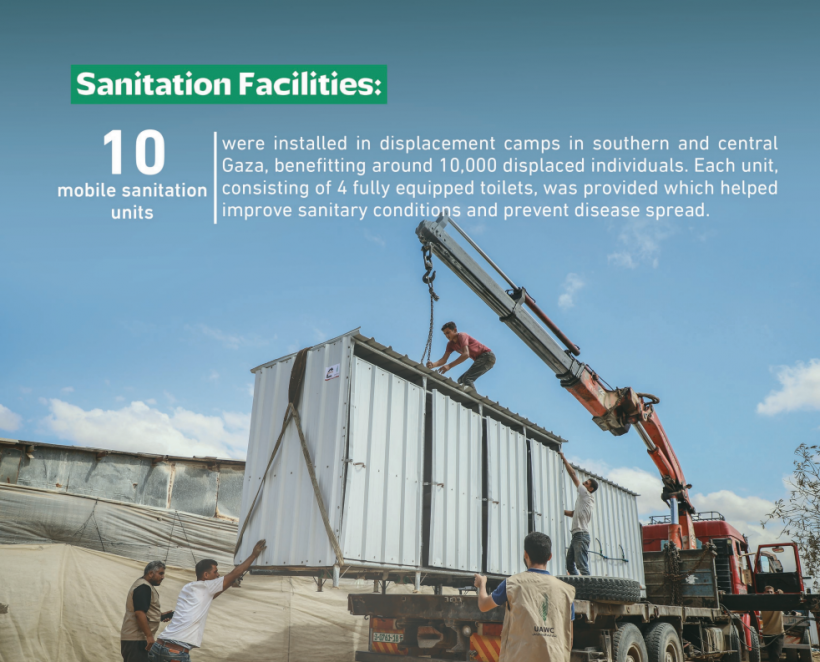 - 위생 시설 설치: 남부 및 중앙 가자 지구 난민 캠프에 4개 화장실이 갖춰진 이동식 위생 시설을 설치하여 약 1만 명의 난민들이 위생적으로 생활할 수 있도록 지원했습니다.