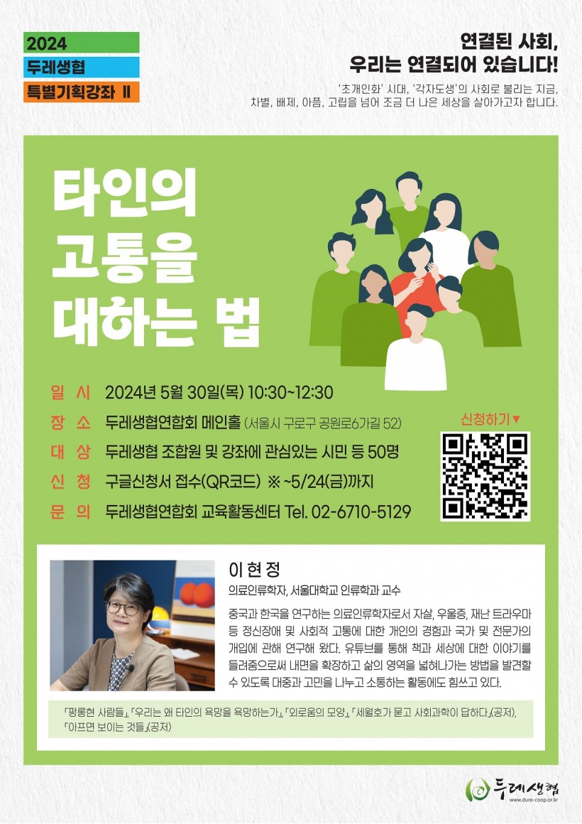 [모집] 두레생협 특별기획강좌 2탄 <타인의 고통을 대하는 법> 안내 페이지 정보 작성자 두레지기 작성일24-04-26 09:13 조회6,046회 댓글0건 목록 본문 연결된 사회, 우리는 연결되어 있습니다! ‘초개인화’ 시대, ‘각자도생’의 사회로 불리는 지금, 차별, 배제, 아픔, 고립을 넘어 조금 더 나은 세상을 살아가고자<2024 두레생협 특별기획강좌Ⅱ> “타인의 고통을 대하는 법”으로 강좌를 진행합니다. 두레생협 조합원 및 관심있는 분들의 많은 참여 바랍니다. [문의] 두레생협연합회 교육활동센터 Tel.02-6710-5129 신청하기 ▶ 신청하기 ▶ 목록