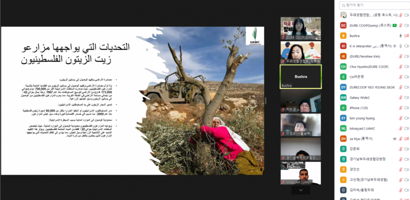 지난 2월 13일(화) 두레생협 올리브오일 생산자 파트너 단체인 UAWC와 온라인으로 만나, ①올리브수확과 올리브유 생산에 대한 생산지 상황과 ②현재상황 등에 대해 직접 듣는 온라인간담회를 진행했습니다.