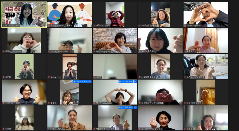팔레스타인 현지 시간을 고려하여, 한국시간으로 저녁 6시부터 시작하였는데, 67명의 조합원님들이 참여하여 늦은 시간까지 함께해 주셨습니다. 또한, 불안정하고 어려운 상황 속에서도 팔레스타인 UAWC Moayyad이사님과 Bushra올리브오일 생산자님이 온라인으로 참여해 주셨습니다.