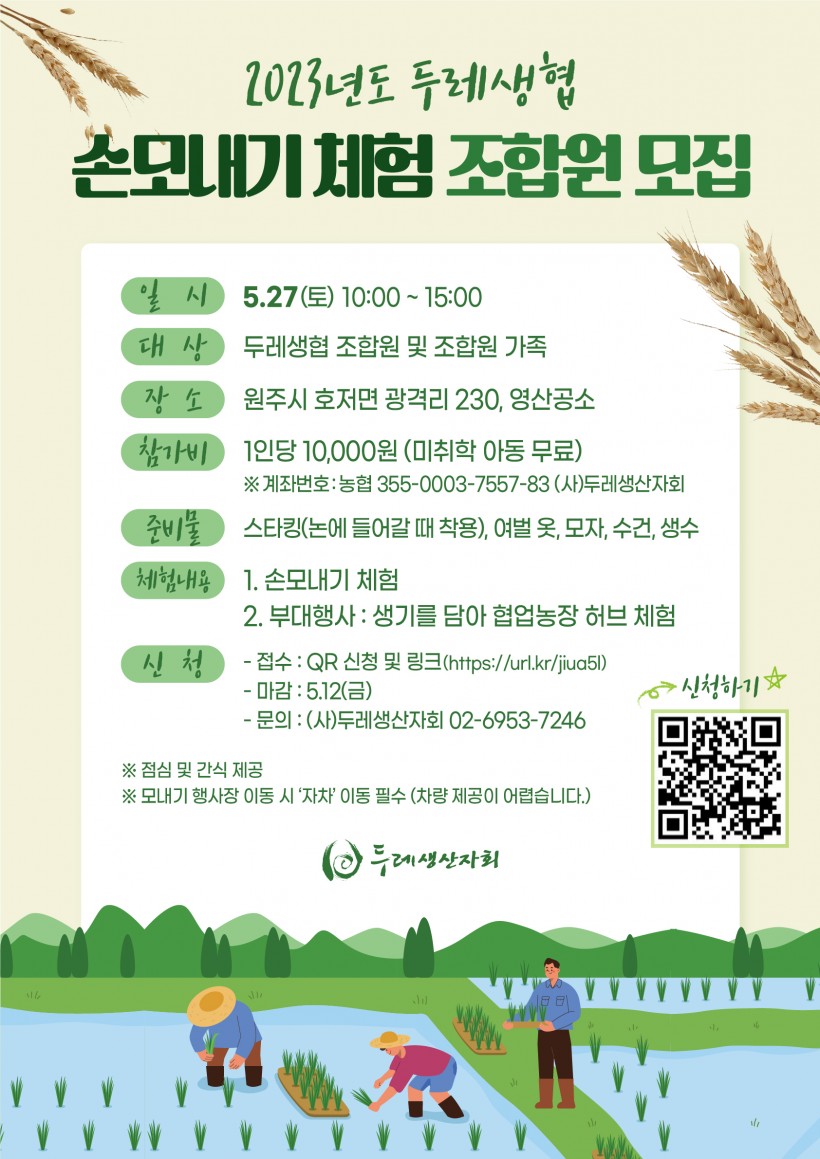 [모집]2023 두레생협 손모내기 체험 조합원 모집